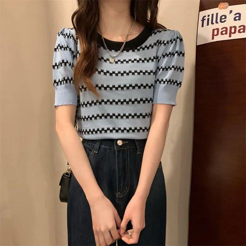 Fashion 2023 Summer Cute Style Fresh Sweet Ice Cool Silk Pullover Round Neck Slim-Fit Blouse For Women